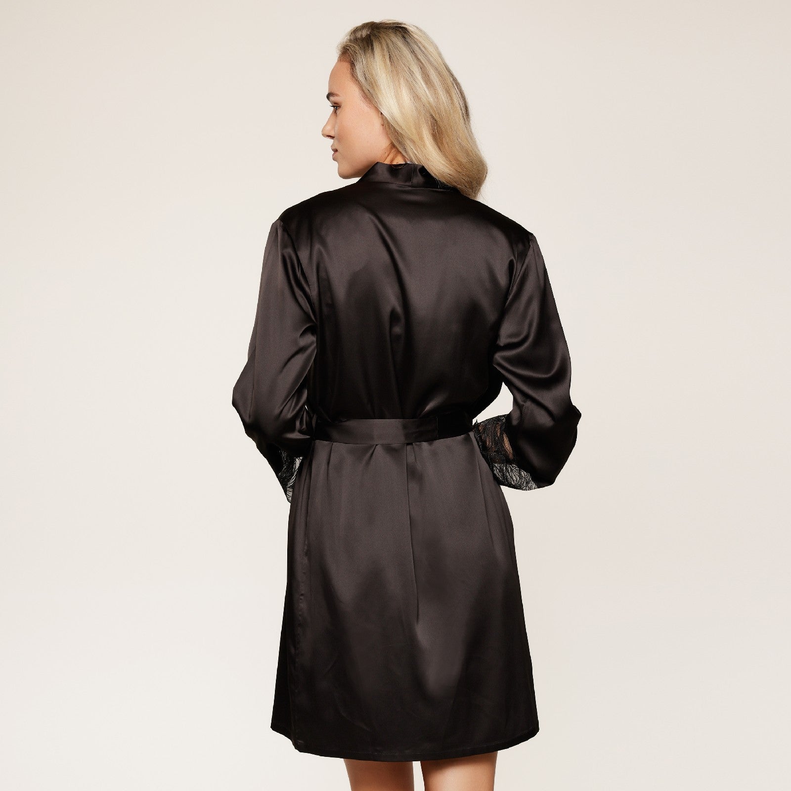 Oplev LingaDore Black Kimono Sort, en elegant og sofistikeret satinkimono, der falder smukt over kroppen. Den sorte satén fremhæves af fine blondedetaljer på ærmerne, hvilket giver et yndefuldt og feminint udtryk.