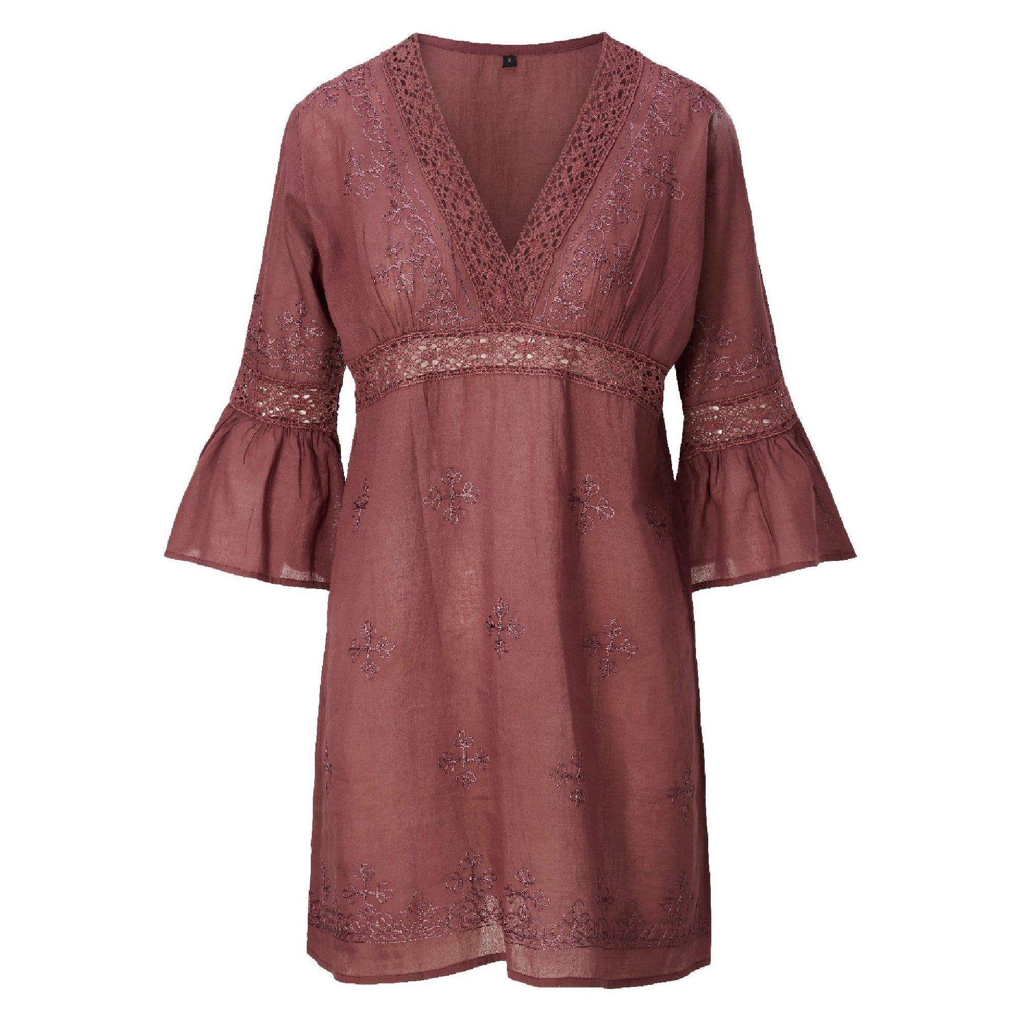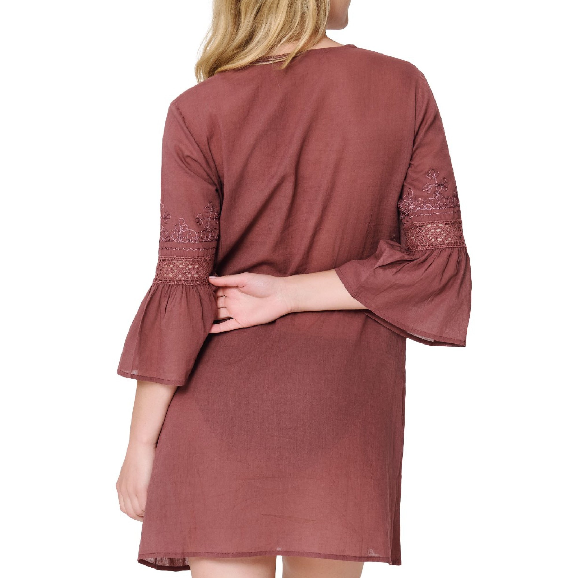 Kjolen har en smuk V-udskæring og 3/4-ærmer med vidde, og de fine broderidetaljer tilføjer et feminint touch. Den går over knæet og skaber et afslappet, men stilfuldt look, perfekt til både strand og solrige sommerdage.