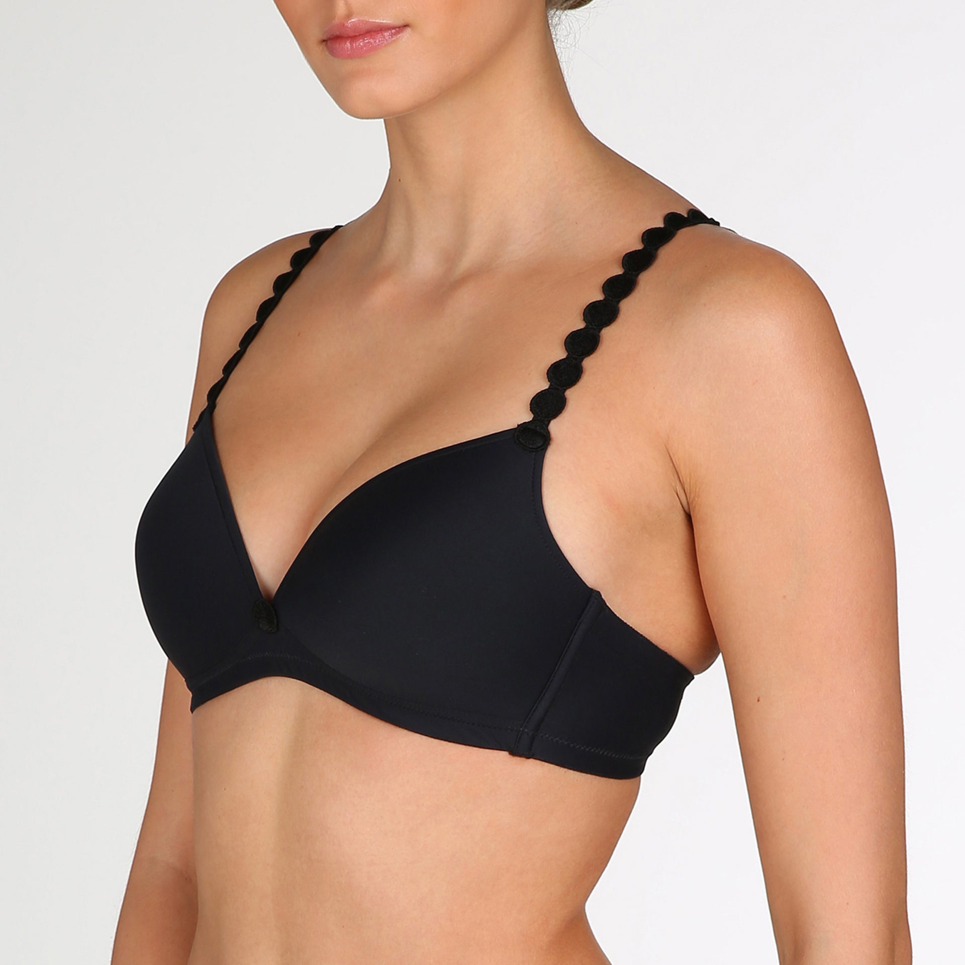 Tom BH uden bøjle Sort. Skøn og behagelig Tom BH uden bøjle i sort. Denne Tom BH uden bøjle har de fine prikkede stropper som Tom-serien er kendt for. Der er en let vattering i skålene. Tom BH uden bøjle har justerbare stropper der både kan bruges normalt og rundt om halsen.