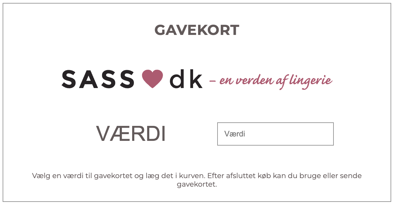 Så skal du glæde den du holder af med et gavekort på et valgfrit beløb til Sass.dk. Gavekortet kan bruges frit på www.sass.dk hvor du finder et stort udvalg fra 50+ luksusmærker inden for lingeri, loungewear og badetøj.