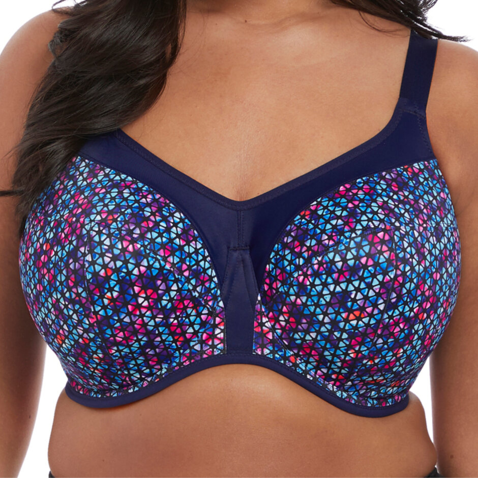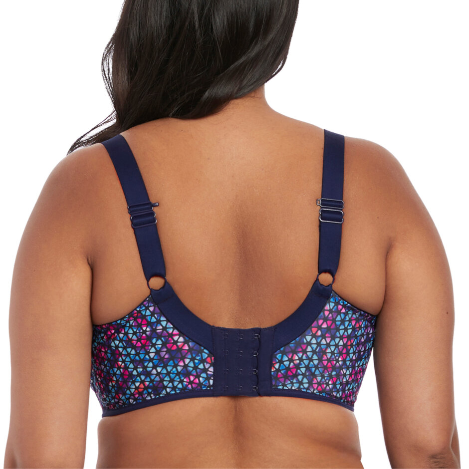Energise Sports BH Navy Geo. Skøn Mønstret Sports BH i flotte farver. Denne Mønstret Sports BH er fra Elomi og er god til de større barme. Mønstret Sports BH er med bøjle og en god støtte til barmen. Der er støtte, hold og adskillese af brystet. Mønstret Sports BH har brede stropper som optimerer hold og støtte. Du kan yderligere krydse dem på ryggen, for ekstra støtte.