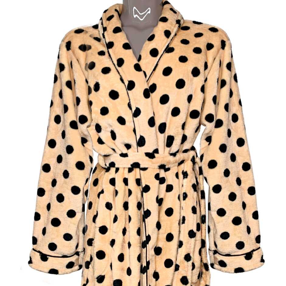Champaign Bubbles Robe. Skøn morgenkåbe med prikker. Denne fine Champaign Bubbles morgenkåbe er ekstrem blød i fleece kvaliteten, og super flot blank. Med denne fleece kåbe får du en komfortabel morgenkåbe med sort piping langs krave og på ærmekant, i en behagelig længde til under knæet. Champaign Bubbles morgenkåbe har bælte i taljen og skjulte lommer, til dine nøgler andet når du går mod stranden for at vinterbade.