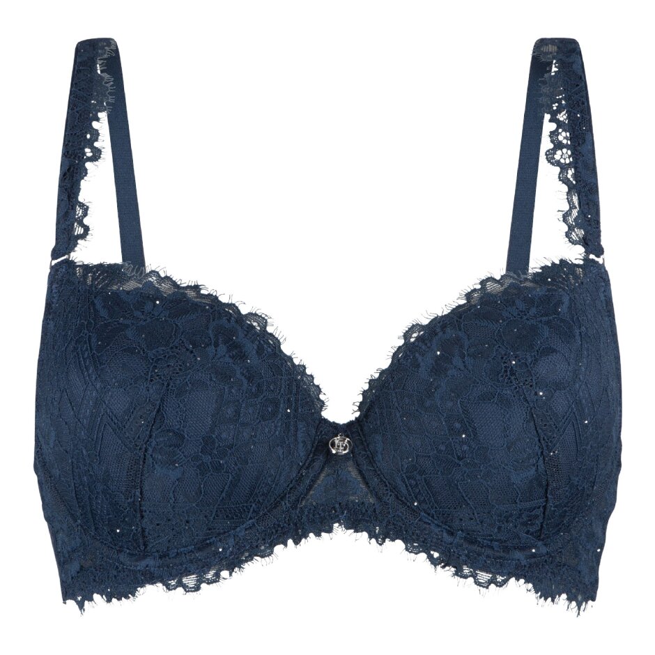 Oplev LingaDore T-shirt BH med Blonde Midnight i en glitrende blå nuance, designet til dig, der ønsker både komfort og elegance. Denne vatterede bh har bløde blondeskåle med et diskret glimmer vævet ind i stoffet, som giver et sofistikeret udtryk.
