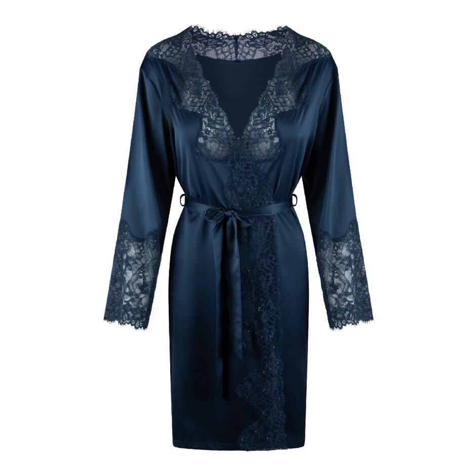 Oplev LingaDore Satin Kimono Midnight i en glitrende blå nuance, hvor blød satin møder delikate blondedetaljer langs kanter og ærmer. Kimonoen kan bindes indvendigt med en lille snor og strammes i taljen med det matchende bælte, hvilket giver en perfekt pasform og et elegant fald.
