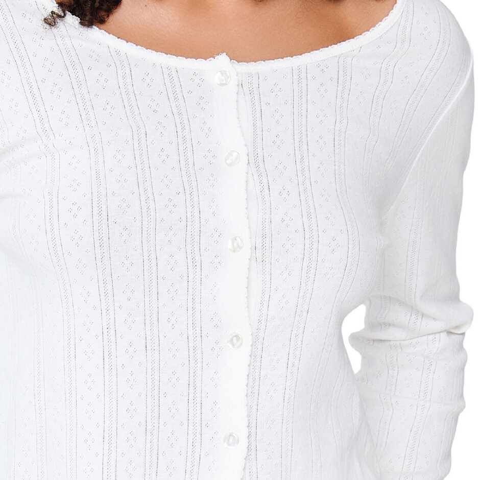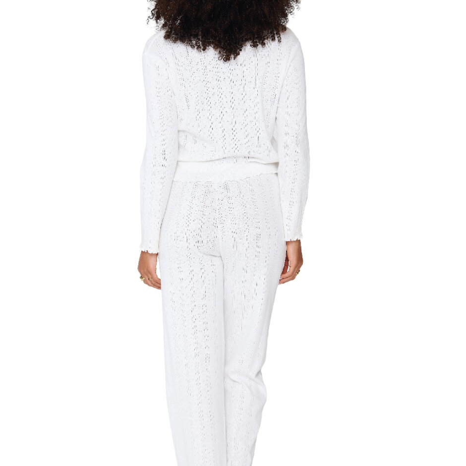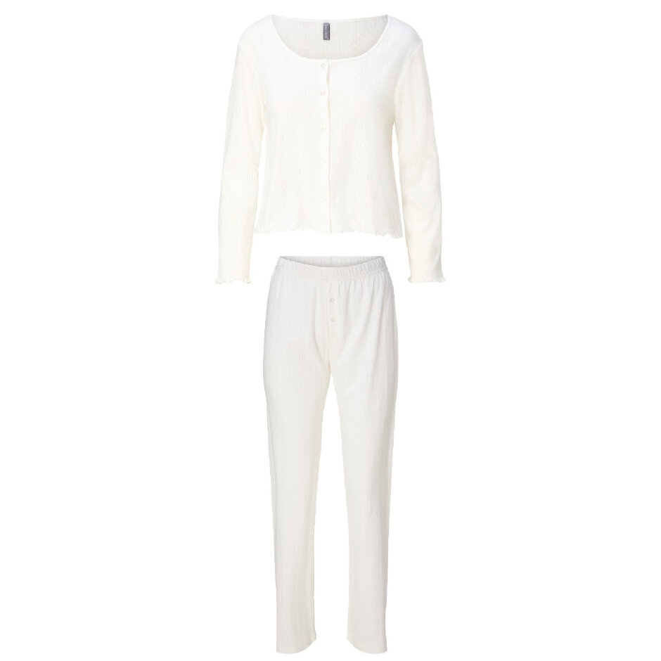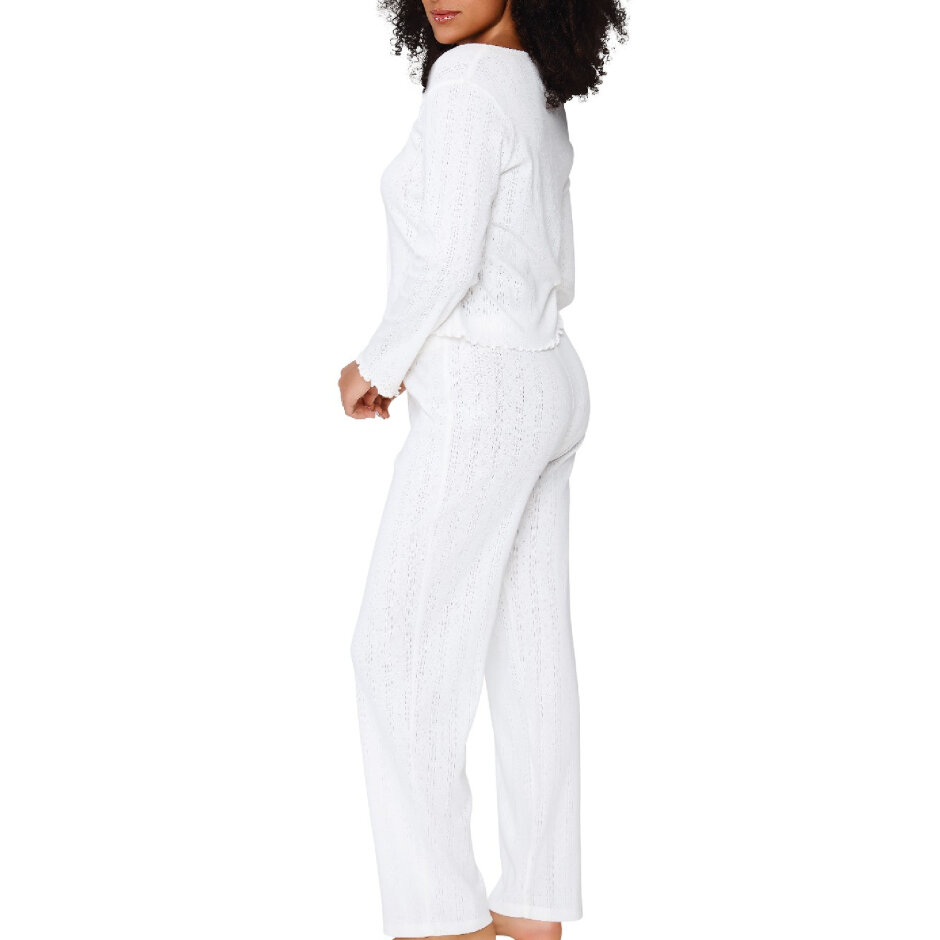 Sættet består af en cardigan med knapper og bukser med lige ben, fremstillet i let og åndbar bomuld, der føles glat og behagelig mod huden. Den delikate pointelle-tekstur i stoffet tilføjer et romantisk og sofistikeret touch, som gør nattøjet både elegant og komfortabelt.