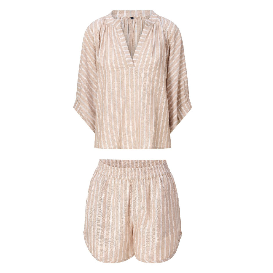 Sættet består af en oversized top og korte shorts med elastisk linning og sidelommer, som sikrer komfort og bevægelsesfrihed. Det afslappede design giver et elegant og sommerligt look, perfekt til stranddage eller afslappede udflugter.