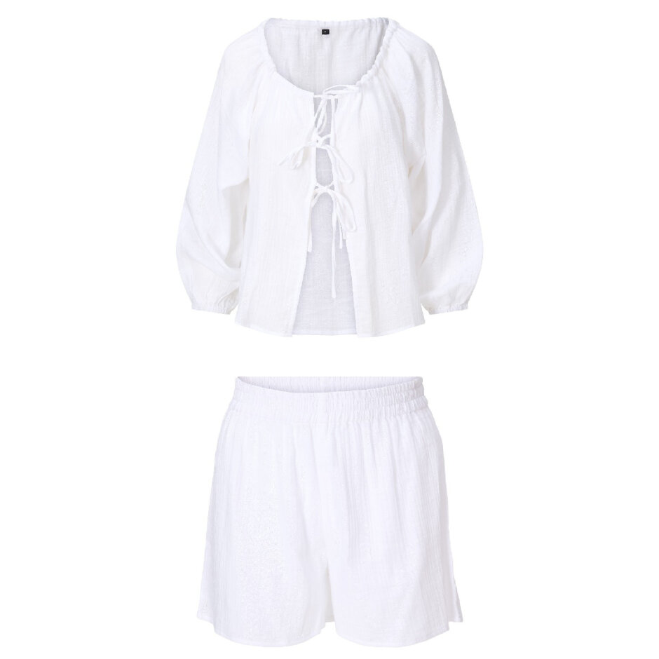 Sættet består af en lang top med bindedetaljer foran og matchende shorts med afslappet pasform og elastisk linning, som sikrer både komfort og stil. Det luftige design gør sættet perfekt til varme sommerdage ved stranden eller til afslappet feriestil.