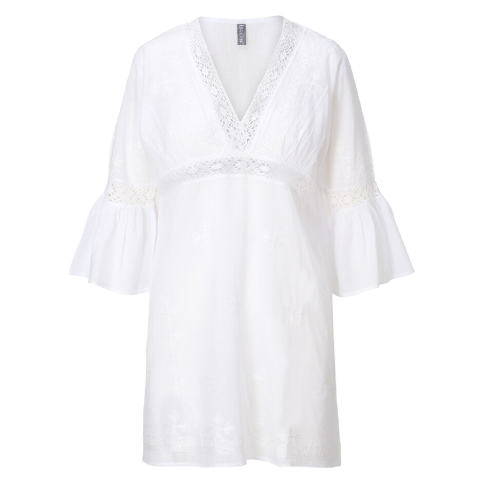 Tunikaen har en smuk V-udskæring og 3/4-ærmer med vidde, og de fine broderidetaljer tilføjer et feminint touch. Med sin længde over knæet skaber tunikaen et elegant og sommerligt look, perfekt til strand eller afslappede sommerdage.