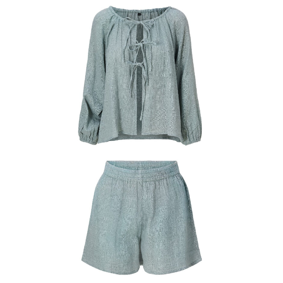Dette lækre strand sæt i en blød eucalyptusfarve giver dig øjeblikkelig Ibiza-stemning. De matchende shorts har en afslappet pasform og en elastisk linning, der sikrer ultimativ komfort, uanset om du slapper af på stranden eller nyder en sommerdag i solen.