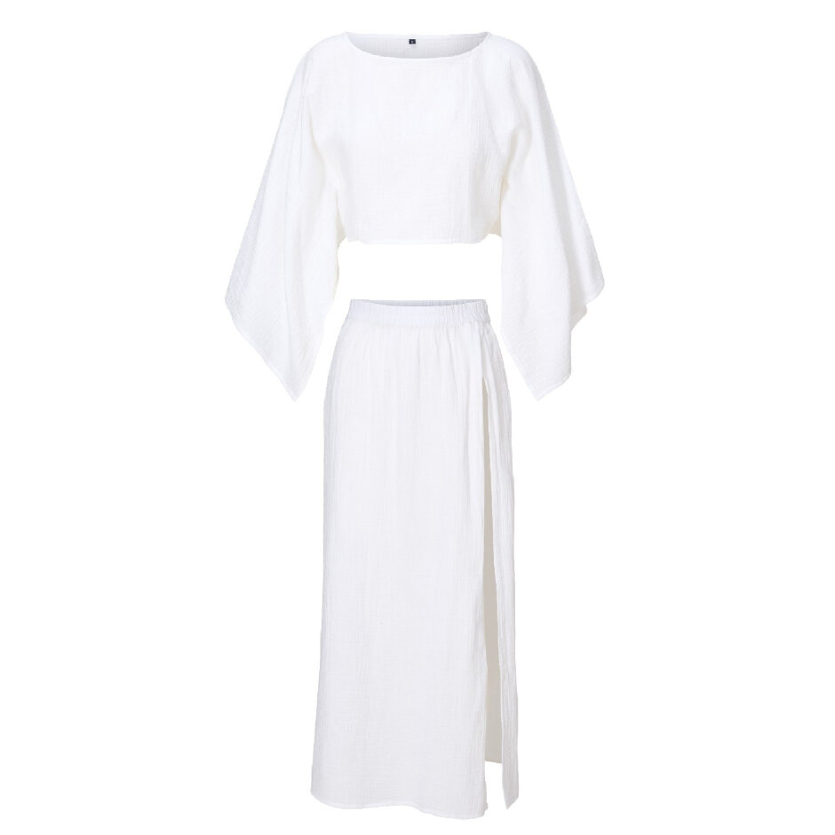 Den cropped top med svajende ærmer kombineres smukt med den matchende nederdel, som har en høj slids i siden og tilfører et feminint og sensuelt udtryk. Den rene White-farve fremhæver et friskt og tidløst look, som let kan styles både til stranden og til sommerens fester.