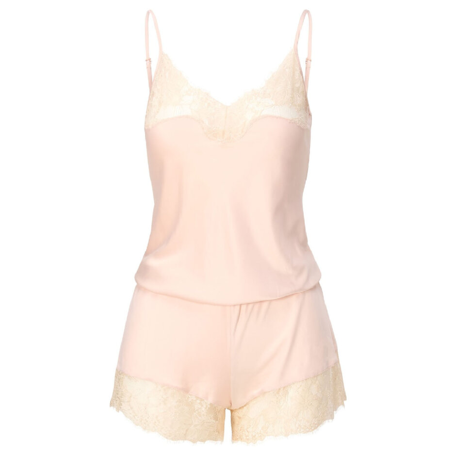 Sættet har justerbare spaghettistropper, så pasformen kan tilpasses individuelt, og fine blondedetaljer langs halsudskæringen og forneden på benene tilføjer et feminint og sofistikeret touch. Nattøjsættet fås i størrelserne XS–4XL i den varme, glansfulde gold beige farve.